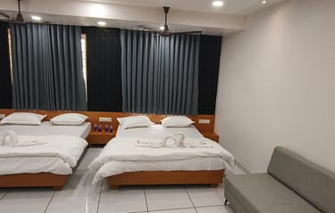 Indulge in our spacious Family Room, designed for comfort and relaxation, offering stunning views, complimentary TV and Wifi, and easy access to the Shree Dwarkadhish temple for all travelers.